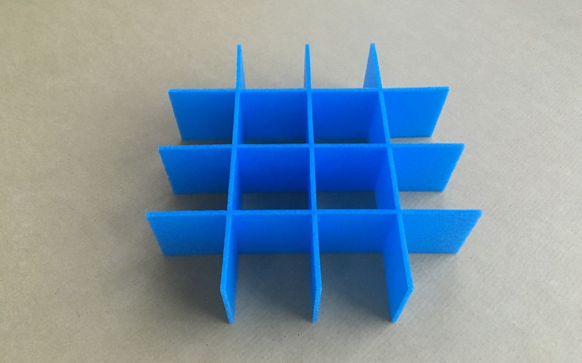 折りたたみ可能な紙製の中仕切りです。段ボールの組み仕切りと違い部品が接着されているので、バラバラになる事はありません。また、製造に型は不要です。